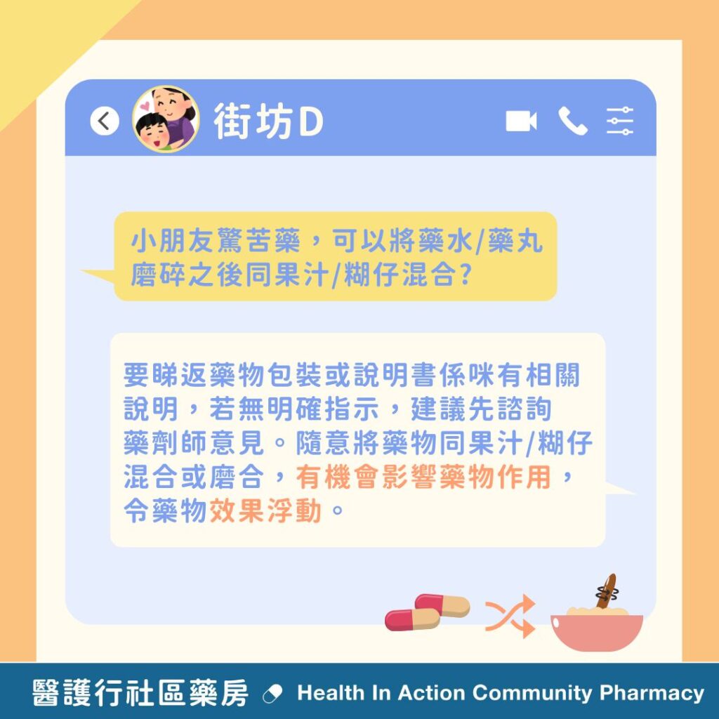 1️⃣小朋友驚啲藥好苦,可唔可以將藥水/藥丸磨碎之後同果汁/糊仔混合?