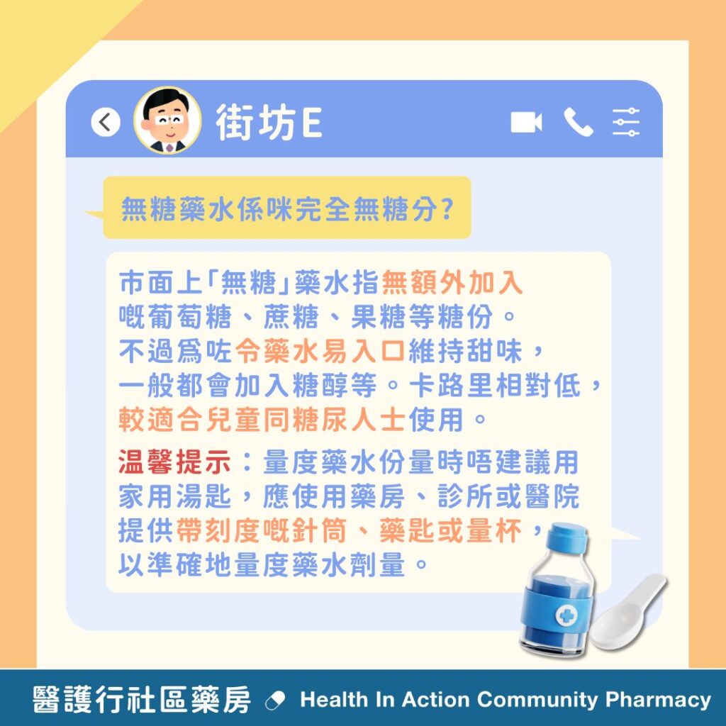 市面上「無糖」藥水係指無額外加入葡萄糖、蔗糖、果糖這些糖份,不過為咗令藥水容易入口去維持甜味,一般都會加入糖醇(例如:山梨糖醇等)或/以及人造甜味劑(例如:阿斯巴甜等)。相對只需用少量就提供到與葡萄糖、蔗糖等相等嘅甜味,卡路里都相對低,較適合兒童同糖尿人士使用。