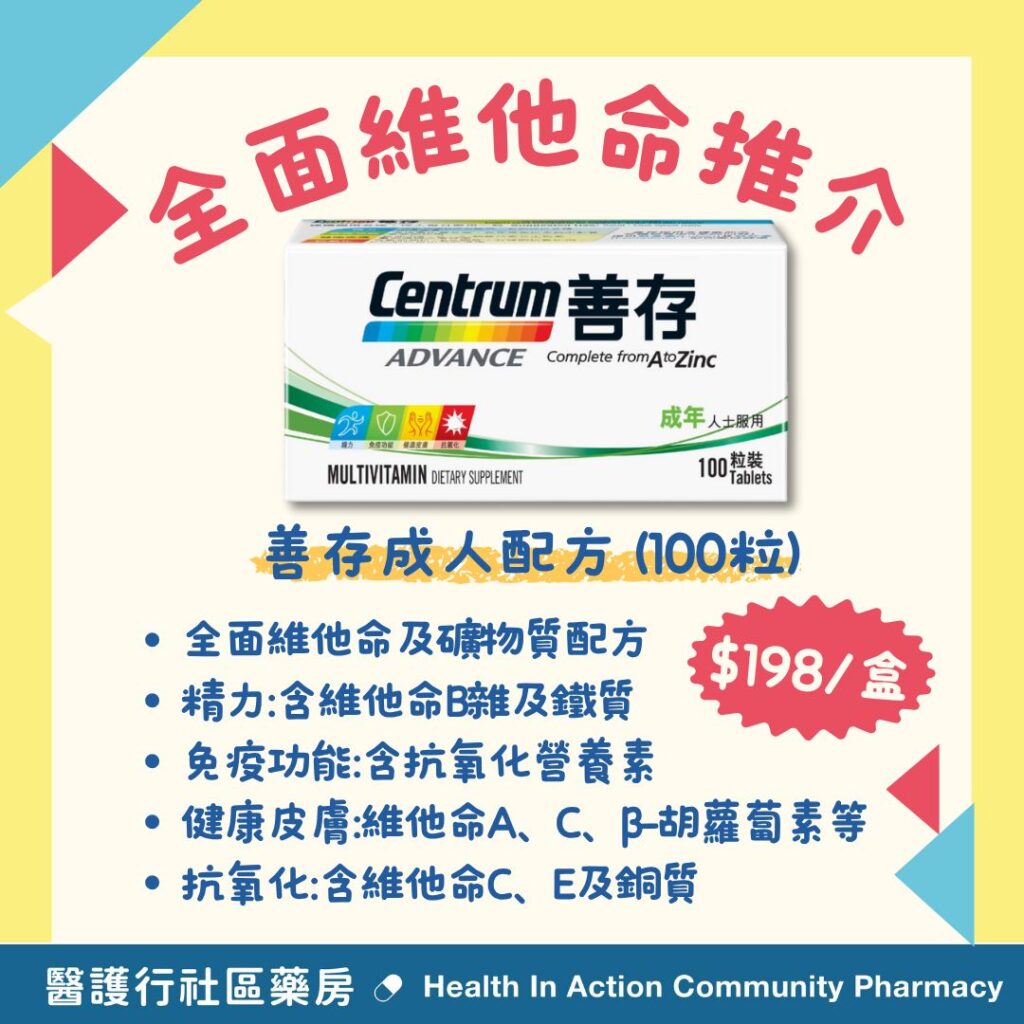 揀維他命個陣又想補充呢樣,又想補充埋個樣營養?唔使再頭痕!全新嘅「善存成人配方」,一盒有齊多款維他命,全面助你補充各種日常所需。