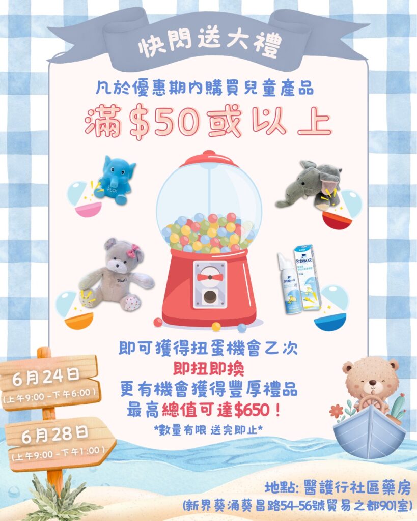 係6月24日同6月28日指定時段,我哋有多達7款產品以超荀優惠價就買到,詳情可參閱圖中。記住唔好錯過優惠!同場加映期間限定活動,凡購買兒童產品滿$50或以上,就可獲扭蛋機會乙次,即扭即換獎賞,更有機會換領到價值豐厚嘅禮品,最高總值可達$650!圖中優惠產品同樣適用。
