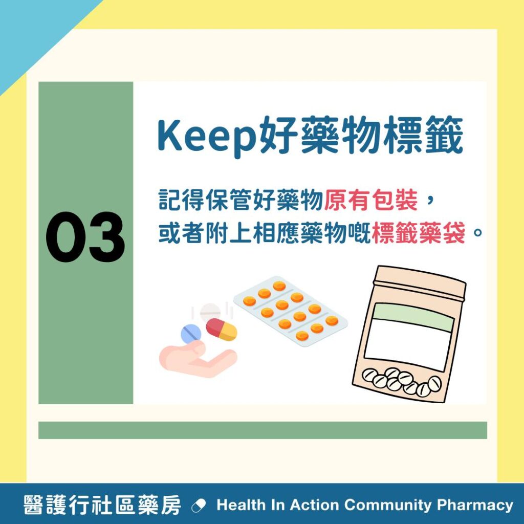 藥物標籤同包裝上有唔少重要資訊,包括藥物成份💊、用途、劑量、服用方法、注意事項等,妥善保管好藥物原有包裝,或者保留附有藥物標籤嘅藥袋,可以幫助我地正確善用藥物,或有助於與醫護人員之間嘅溝通🤝🏻🤝🏻。