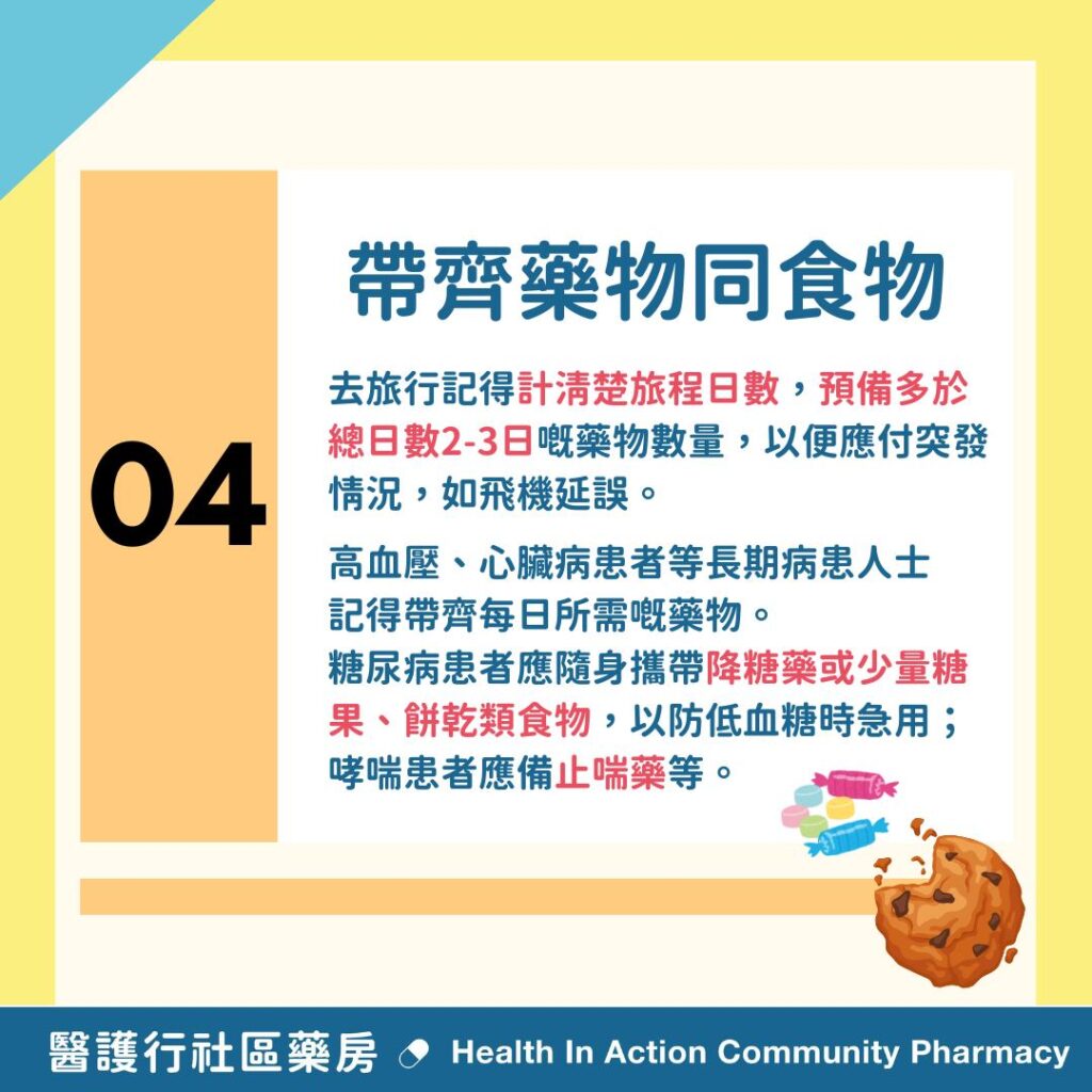 特別係高血壓、心臟病患者🫀等長期病患人士,記得帶齊每日所需嘅藥物。糖尿病患者應隨身攜帶降糖藥或少量糖果🍬、餅乾類食物🍪,以防低血糖時急用;哮喘患者應備止喘藥等。