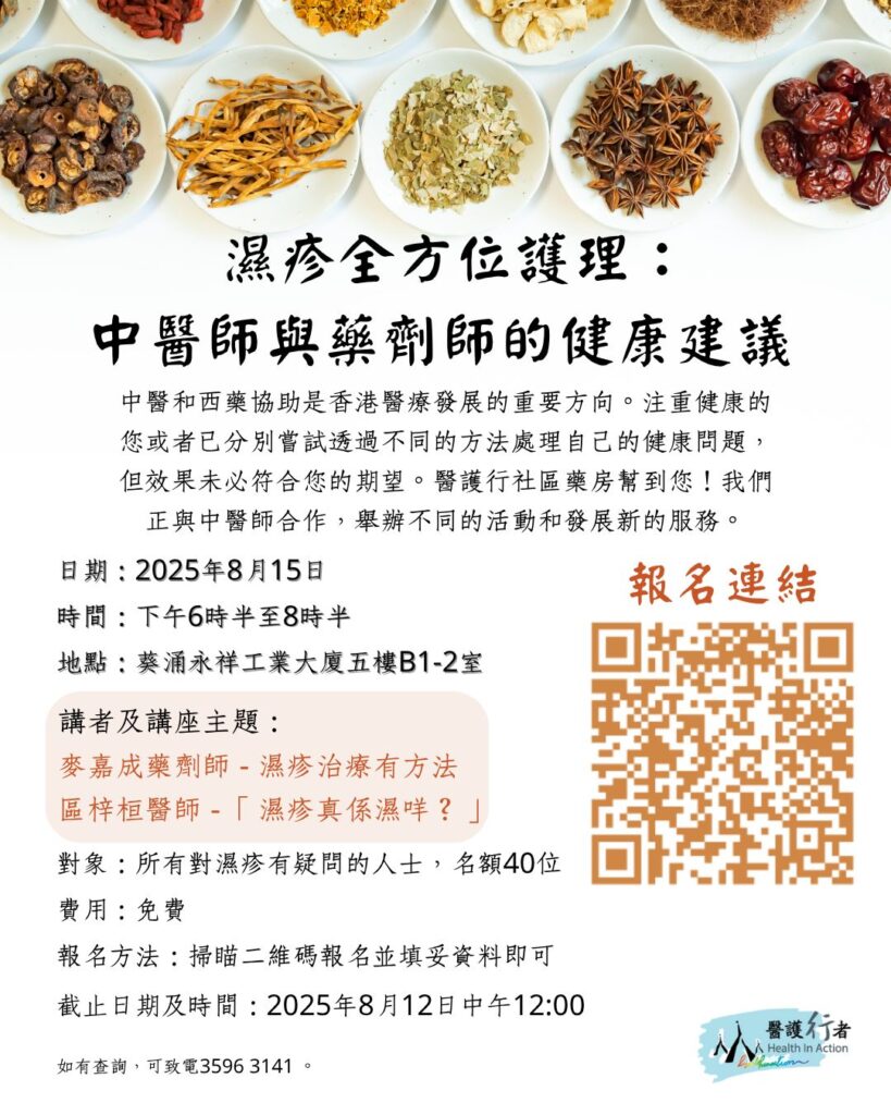 承接上一次中醫藥劑協作活動,醫護行社區藥房繼續與中醫師合作,舉辦免費濕疹護理講座。中醫師和藥劑師分別會以中西醫的角度分析濕疹的成因,及提出健康建議,歡迎濕疹患者和有與趣了解濕疹的人士報名參與!