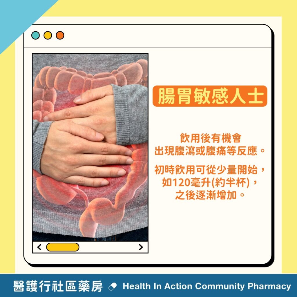 1️⃣腸胃敏感人士:飲用後或有機會出現腹瀉或腹痛等反應,初時飲用營養奶可從少量開始,如120毫升(約半杯),之後逐漸增加