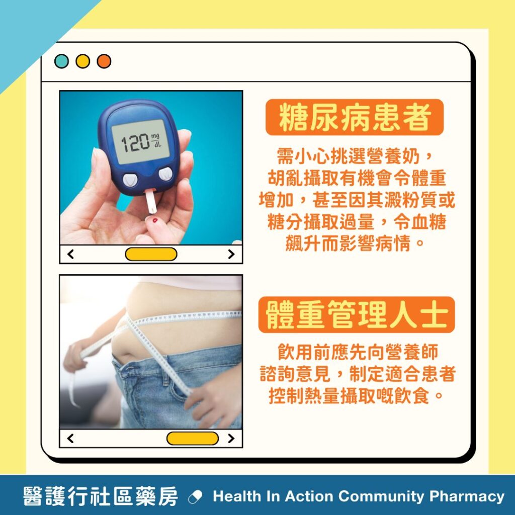 2️⃣糖尿病患者:需小心挑選營養奶,胡亂攝取有機會令體重增加,甚至因其澱粉質或糖分攝取過量,令血糖飆升而影響病情