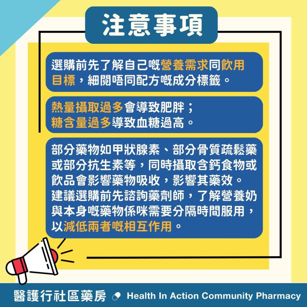 ▪️部分藥物如甲狀腺素、部分骨質疏鬆藥、部分抗生素等,同時攝取含豐富鈣質的食物或飲品會影響藥物吸收,影響其藥效。建議選購前先諮詢藥劑師,了解營養奶同本身嘅藥物係咪需要分隔時間服用,以減低兩者嘅相互作用