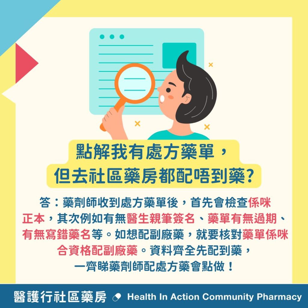 上篇提到藥劑師可以提供輕微疾病嘅諮詢服務,除此之外,藥劑師仲可以配發處方藥物,只要有⭐合符資格嘅處方正本⭐,歡迎大家聯絡我地醫護行社區藥房配藥。有街坊成日問,點解有處方藥單但都配唔到藥?其實藥劑師收到處方藥單後有好多資料要檢查🔍🔍,核對無錯漏先配到藥。一齊睇睇當中有咩流程要做啦!