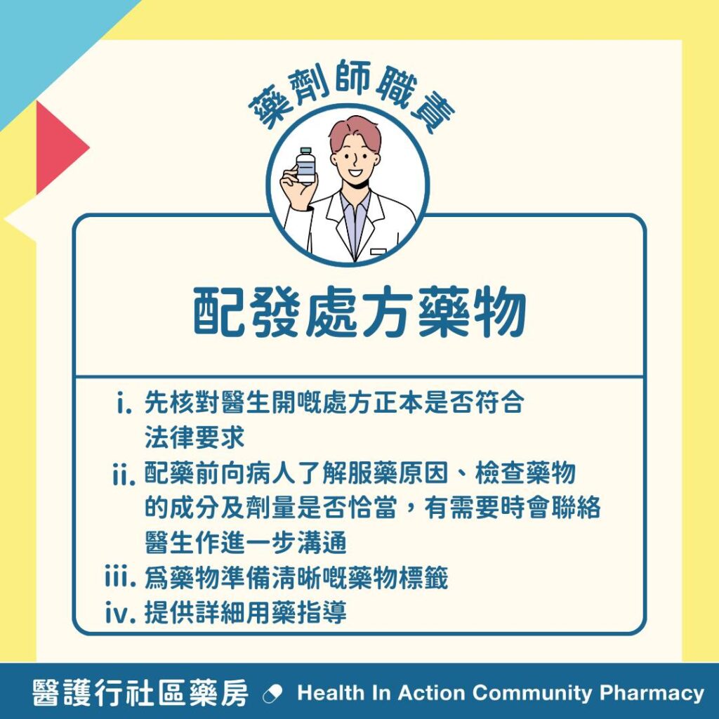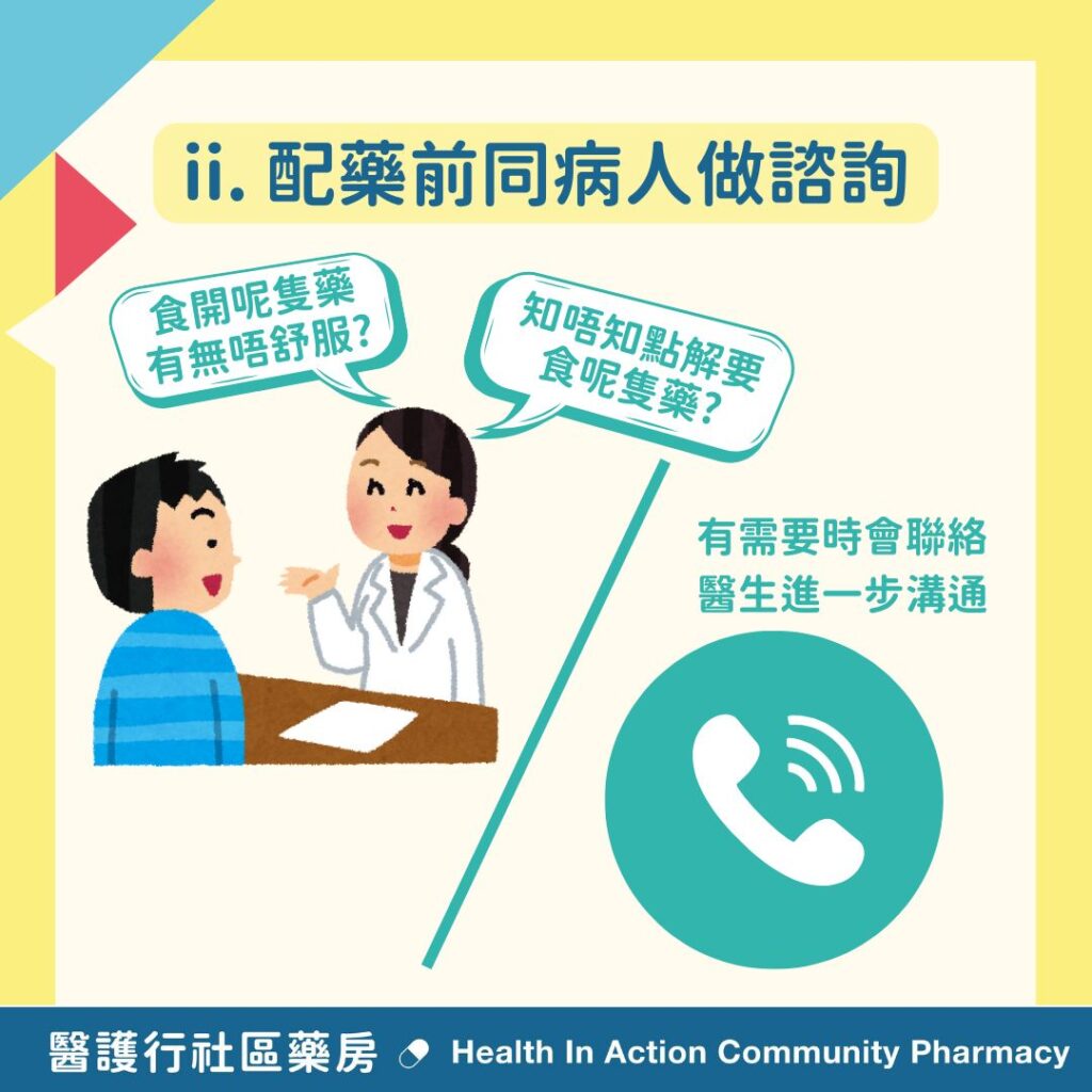 ii. 藥劑師配藥前向病人了解服藥原因、檢查藥物的成分及劑量是否恰當、會否同現時服用嘅長期藥物或保健品出現相沖,有需要時更會📞聯絡醫生作進一步溝通。