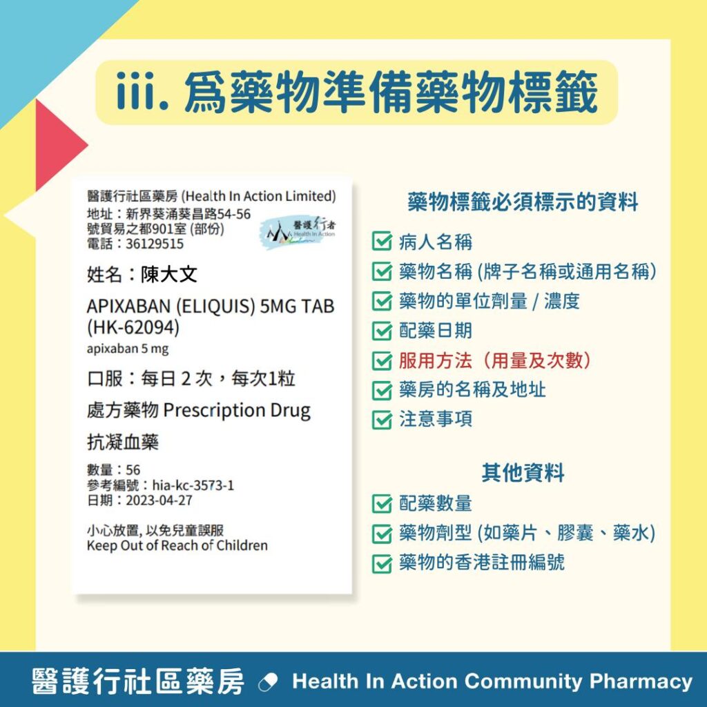iii. 藥劑師會於藥物上附清晰嘅藥物標籤。