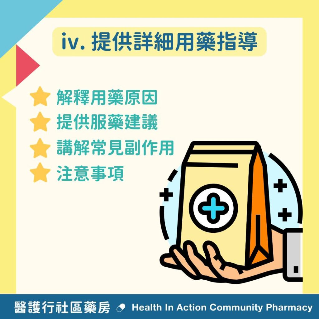 iv. 藥劑師提供詳細用藥指導🗣️,如解釋用藥原因、提供服藥建議、常見的副作用、其他注意事項等,希望服藥人士可以更了解自身治療方案。