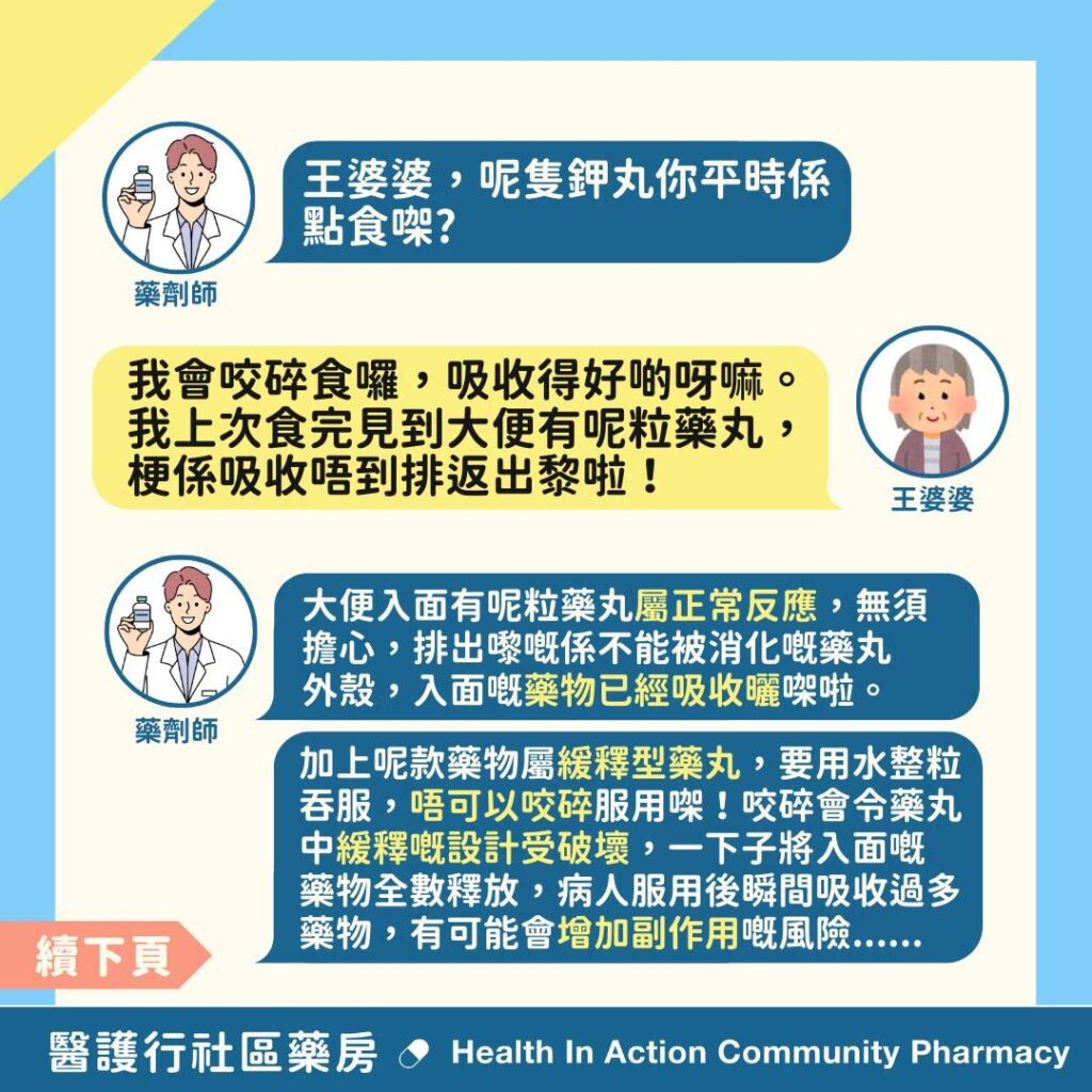 🧑🏻⚕藥劑師:「王婆婆,呢隻鉀丸你平時係點食㗎?」