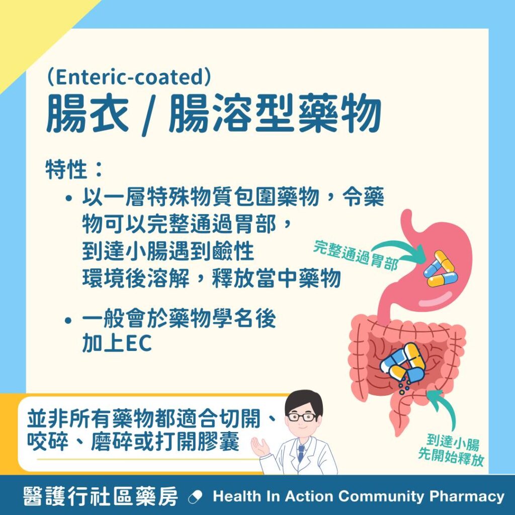 腸溶型藥物: 一般會於藥物學名後加上EC(Enteric-coated)
