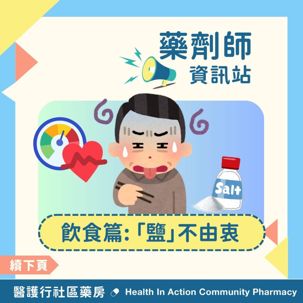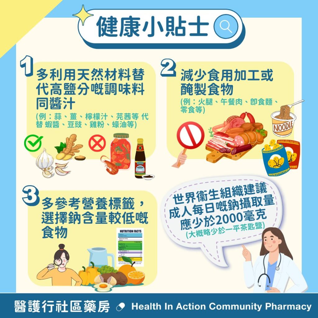 藥劑師:「豉油嘅鈉含量都好高,同高鹽一樣對血壓都易造成不良影響🙅🏻♂️。建議你試吓煮啲少汁嘅餸,避免烹調加工或醃製食物,攝取多啲蔬果同水份。食飽飯可以同太太出去散吓步👫🏻,對你嘅血壓同太太嘅病情都會有好大幫助㗎。」