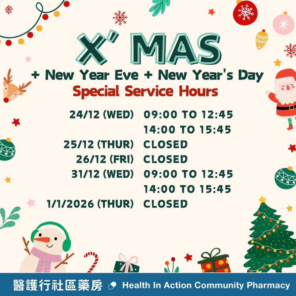 聖誕節將至,以下係我地假期嘅特別營業時間安排: