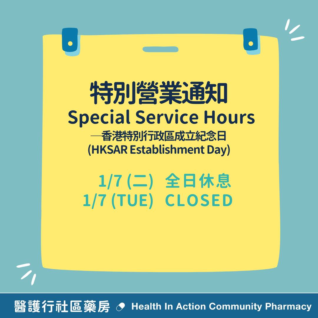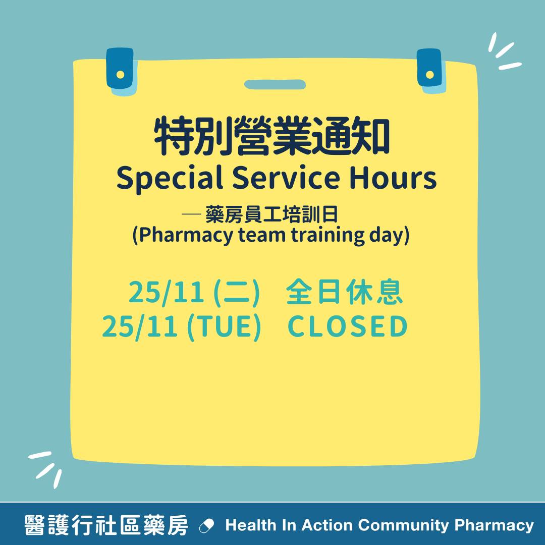 本藥房將於11月25日(星期二) 進行藥房員工培訓日,屆時全日休息,暫停開放一天。