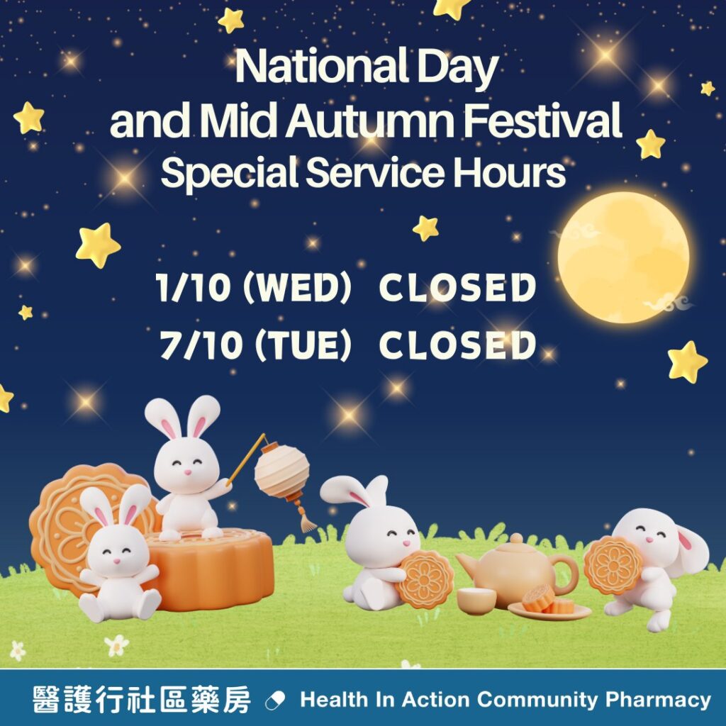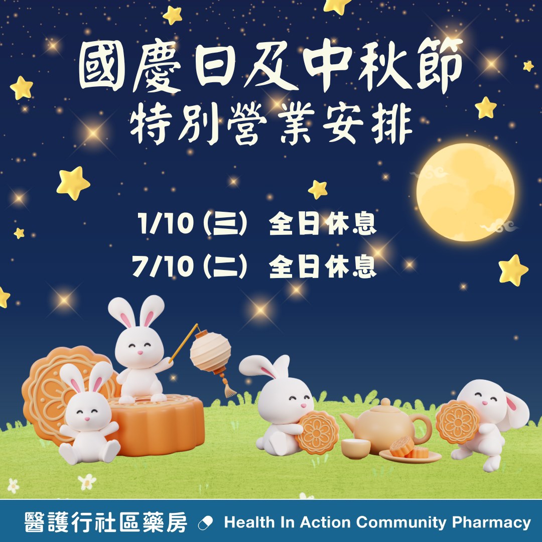 小編預祝大家國慶日同中秋節快樂🥳,以下係我地假期嘅特別營業時間安排:
