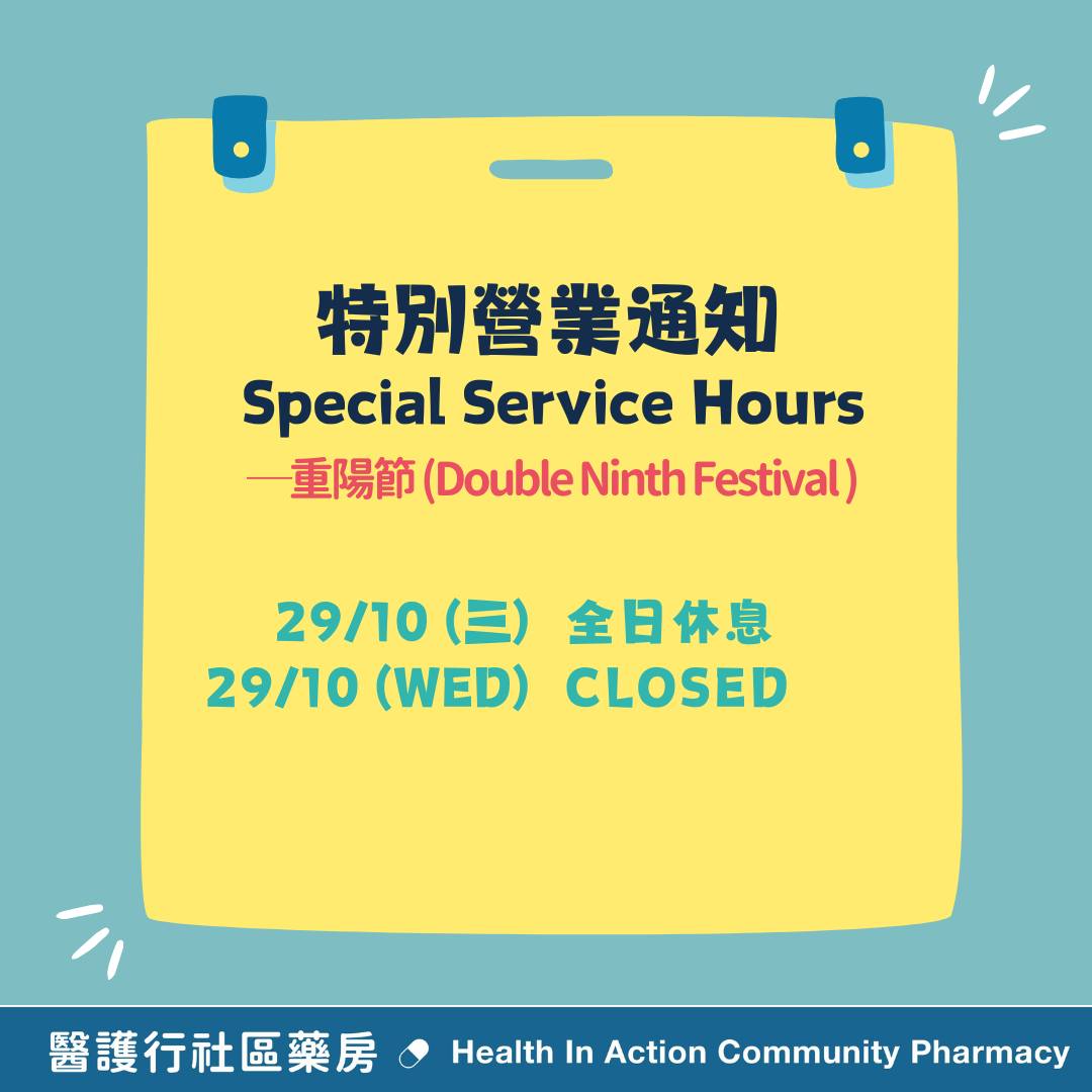 重陽節將至,以下係我地假期嘅特別營業時間安排:29/10 (三) : 全日休息