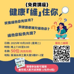 不同維他命各有功用,有助新陳代謝同預防慢性疾病🤩。但你又知唔知點吸收或補充維他命先啱?🤔🤔今期免費講座同你深入拆解各種維他命迷思,快啲把握機會報名啦!
