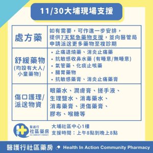醫護行社區藥房一直服務全港市民,為應對大埔宏福苑嚴重火災後居民及社區的需要,我們團隊已連續3天在 大埔社區中心 提供現場支援,今日(11月30日)繼續到場盡力協助受災居民。