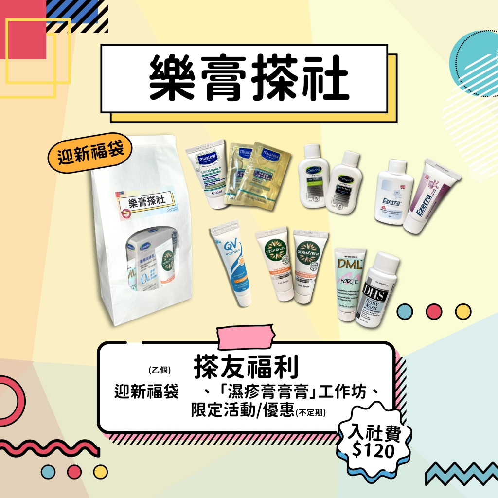 每五個香港人便有一個在不同時期患上濕疹,尤其兒童的情況更為嚴重。濕疹患者不但要忍受各種身體上的不適,亦要承受巨大的心理壓力和金錢負擔。市面上針對濕疹的產品繁多,患者往往要花費大量金錢試用不同牌子的潤膚膏才能找到適合自己的產品。「樂膏搽社」由醫護行社區藥房策劃,我們希望以更經濟的方法幫助「搽友」找出適合自己皮膚的潤膚產品,並通過各種生活上的調整盡量舒緩濕疹情況。
